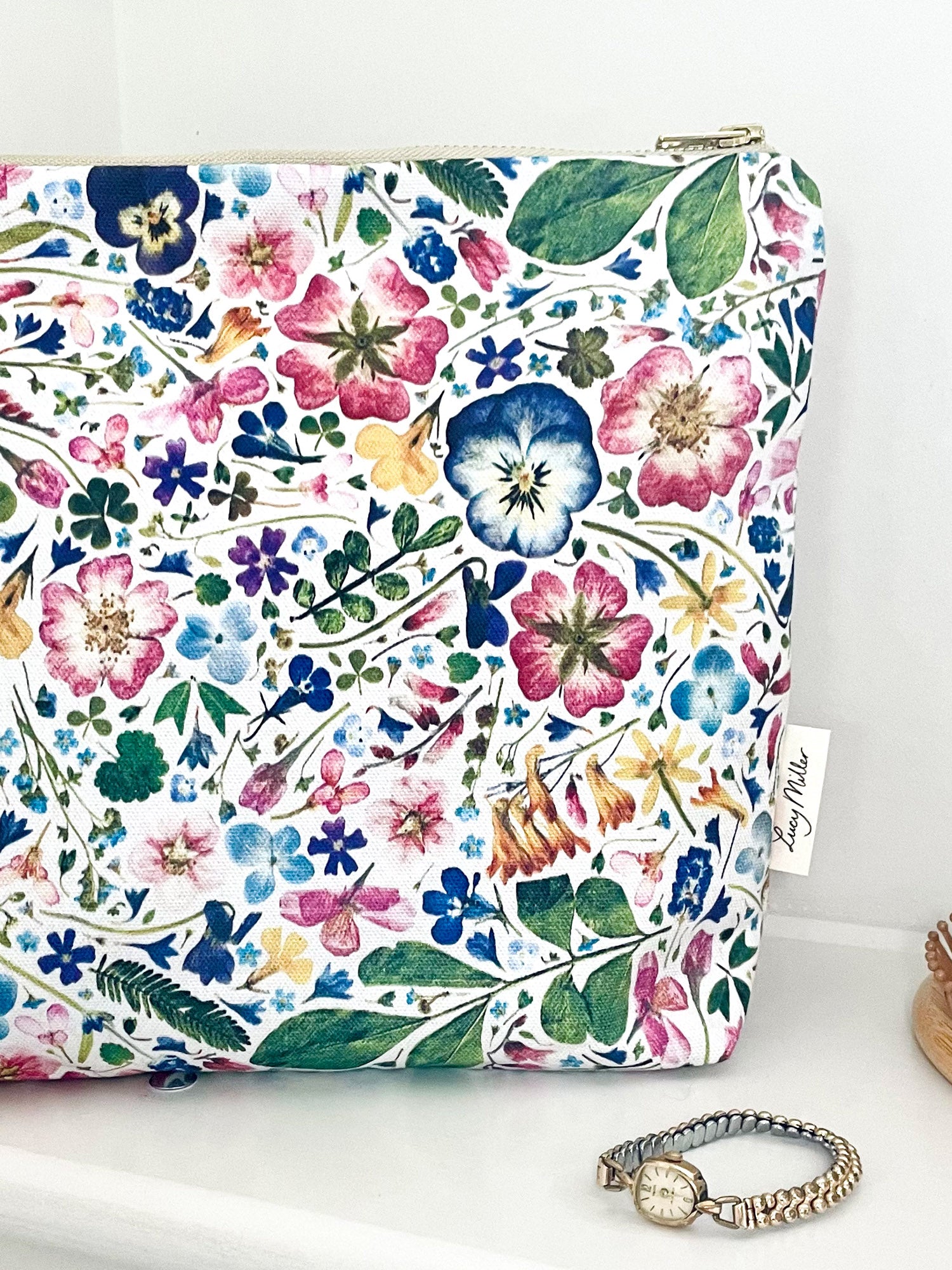 Introducing this Pressed Flower Wash Bag, a stunning accessory crafted from organic cotton, adorning a pressed floral design. Featuring a gold metal zip and waterproof lining, this generously sized cosmetic bag offers protection against spills and leakages. A versatile pouch with many uses, keeping everything organised and easily accessible. The nature-inspired design showcases the beauty of pressed flowers, allowing you to carry a piece of nature with you anywhere. Perfect for weekend getaways or adding a touch of charm to your bathroom, this wash bag is your ideal companion.